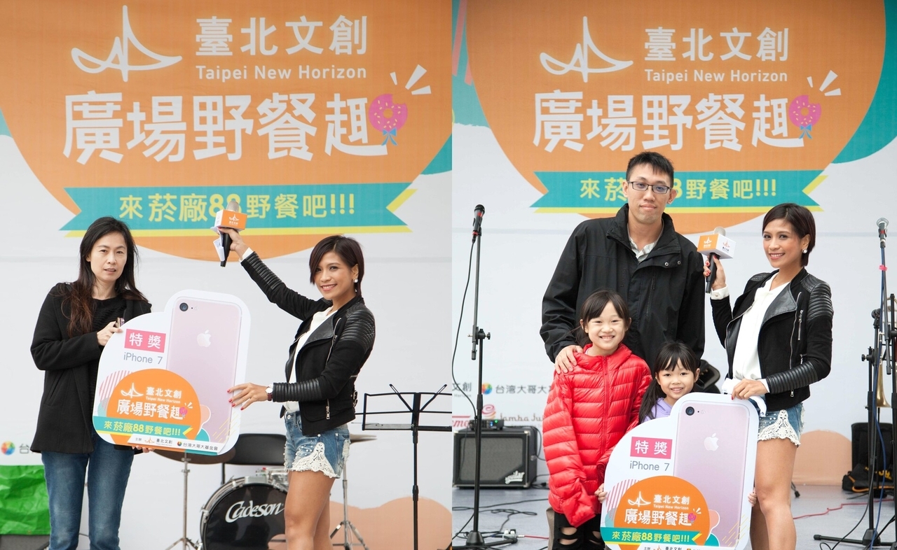 其中一位幸運抽中iPhone 7的聞小姐,興奮地表示:「今天特別一早從新北市趕來,就是為了來參加臺北文創廣場野餐趣活動,最近剛好想換手機,沒想到就抽中特獎,很感謝臺北文創」;第二支iPhone 7則獎落一家四口都出動的可愛家庭,爸爸特別帶著小寶貝們上台:「很開心!沒想到來野餐會抽中大獎!今天真是一家的歡樂時光!」除此之外,現場更加碼舉辦了有獎徵答,現場大小朋友踴躍參與,紛紛拿起手機從《菸廠88》App 找尋答案,送出加碼禮Jamba Juice的隨行杯。